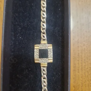 Elegante pulsera con un diseño de eslabones y un detalle central cuadrado. - Diseño de eslabones curvos. - Centro cuadrado con piedra negra y detalles texturizados.