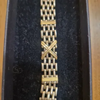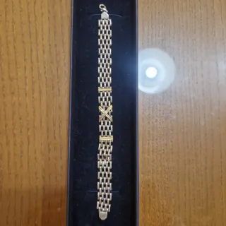 Elegante pulsera con un diseño de eslabones entrelazados. - Combinación de tonos dorados y plateados. - Detalle central cruzado.