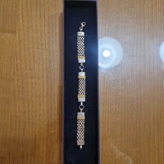 Elegante pulsera con un diseño de eslabones entrelazados. - Combinación de tonos dorados y plateados. - Cierre de mosquetón para mayor seguridad. - Pieza de joyería con un estilo único.