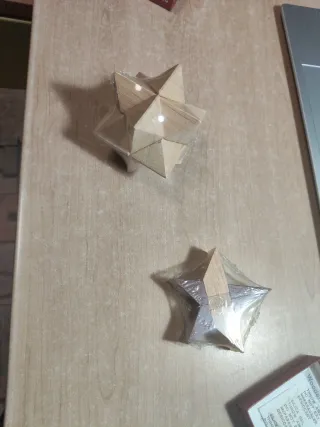 Dos rompecabezas de madera con forma de estrella. - Uno de madera clara. - Otro con detalles en madera oscura y clara.