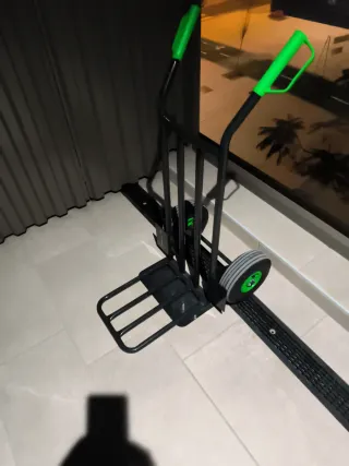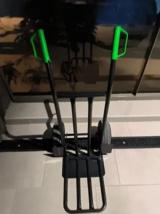 Carretilla plegable de color negro con detalles en verde. Es robusta y fácil de maniobrar. - Estructura metálica. - Ruedas resistentes. - Asas ergonómicas. Tiene una asa de plástico un poco roto como se vee en la foto