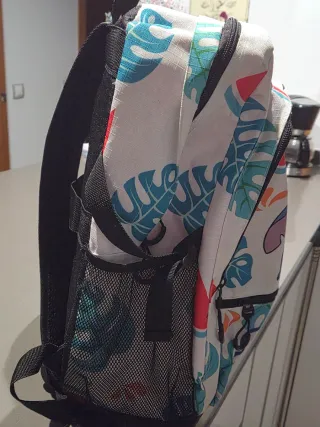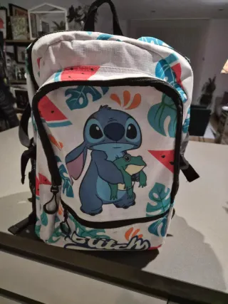 Mochila con un divertido estampado de Stitch y elementos tropicales. - Diseño con Stitch y un sapo. - Motivos de sandías y hojas tropicales. - Detalle de la palabra Stitch en la parte inferior.