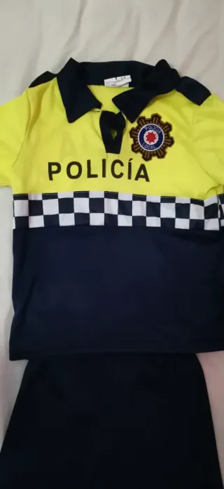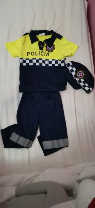 Disfraz de policía para niños, ideal para juegos y fiestas. Talla 3/4 años. - Camisa amarilla y azul con insignia. - Pantalón azul con detalles reflectantes. - Gorra a juego. - Tejido fino.