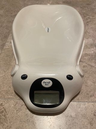 Balanza digital diseñada para pesar a bebés de forma precisa. Su diseño curvo permite acomodar al bebé cómodamente. - Pantalla LCD. - Botones de encendido/apagado, tara y unidad.