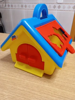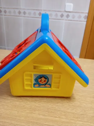 Divertida casa de juguete con formas para encajar. - Diseño de casa con techo a dos aguas. - Puertas rojas que se abren. - Techo con huecos para encajar figuras. - Colores: azul, amarillo y rojo.Ruedas para arrastrar y asa.Figuras de animales de diferentes colores .De juguetes Molto ,muy resistente