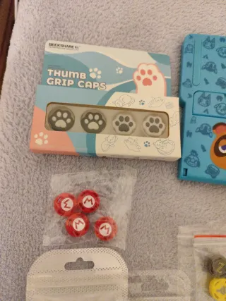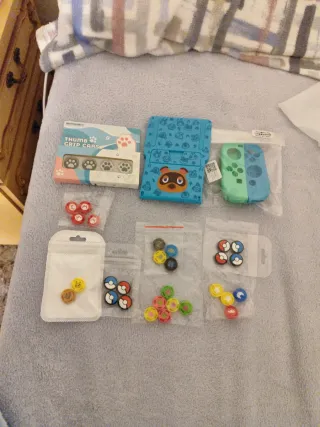 Lote de accesorios para Nintendo Switch. - Funda protectora para Joy-Cons en color verde y azul. Diseño Animal Crossing. 8 euros. - Soporte azul con diseño de Animal Crossing. 8 euros. - Protectores de Joy-Con con diseño de huellas. 10 euros el paquete de 4. - Protectores de Joy-Con con diseños de Pokémon. 5 euros el pack. - Protectores de Joy-Con con diseños de Mario (M). 5 euros el pack. - Protectores de Joy-Con con diseños de Zelda. 5 euros el pack. - Protectores de Joy-Con con diseños de Splatoon. 5 euros el pack.