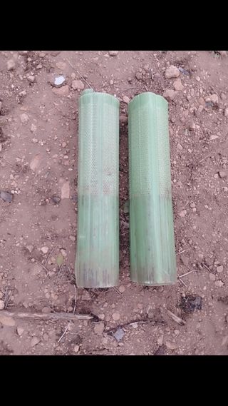Protectores de plástico verde para viñas. Son tubulares y tienen perforaciones para la ventilación. - Material: Plástico. - Color: Verde. - Diseño: Tubular con perforaciones.
