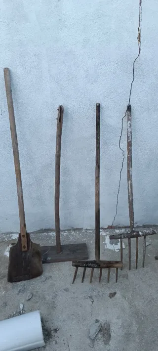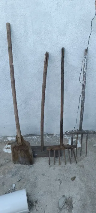 Conjunto de herramientas agrícolas antiguas, fabricadas en madera. Ideales para coleccionistas o decoración rústica. - Pala de madera. - Azada de madera. - Rastrillo de madera.