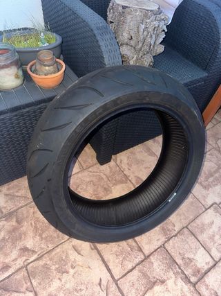 Vendo neumático trasero en muy buen estado (75% de vida restante). Neumático deportivo de doble compuesto, excelente agarre. Sin pinchazos ni reparaciones. Lo vendo por error de medida en mi moto. Nuevo cuesta 150€, no negociable