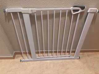 Puerta de seguridad de metal blanco, ideal para mantener áreas seguras. - Estructura de metal resistente. - Diseño de barrotes verticales. - Mecanismo de cierre. - Ajustable para diferentes anchos. Se adapta hasta 83 cm de ancho, sin adaptador 72 cm. Altura 78 cm