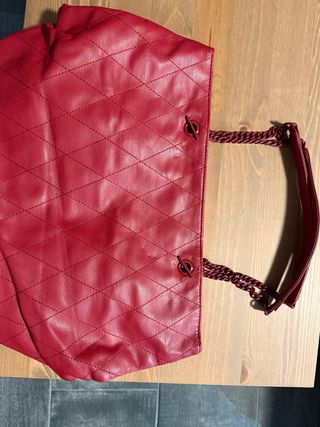 Bolso de mano acolchado con un diseño elegante. - Color: Rojo. - Material: Piel sintética. - Cierre: Botón. - Asas: Cadena y piel.