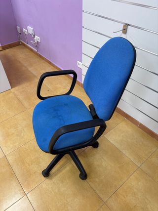 Silla de oficina con un diseño moderno y funcional. - Asiento y respaldo tapizados en tela. - Base y brazos de plástico resistente.