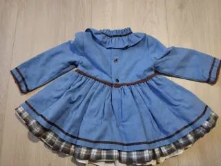 Vestido de la marca Miranda para bebé de 18 meses. - Vestido de manga larga. - Tejido vaquero azul. - Detalle de volantes y cuadros marrones en la falda. - Lazos marrones decorativos. En perfecto estado, 2 puestas.