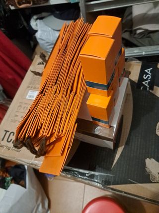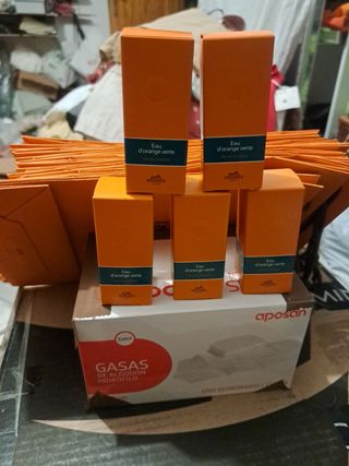 Conjunto de cinco colonias Eau d'orange verte y quince bolsas de la marca Hermès. - Cinco frascos de colonia Eau d'orange verte. - Quince bolsas de la marca Hermès.