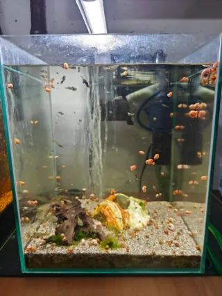 Acuarios completos. Contenido: Acuario Nano kubus 22 l completo (Luz + 2 filtros internos (1 de repuesto) + urna) Tamaño: 29cmx30.4cmx34.9cm (L x An x Al). Este acuario es el de aguas negras y se vende tal y como está sin las 2 piedras (con varios Guppys y caracoles planorbis) 4 años de funcionamiento. Precio completo 65 € Acuario 19 l completo (Luz + Filtro de mochila Marina slim + urna). Tamaño: 25cmx25cmx30cm (L x An x Al). Es el acuario claro y lleva en funcionamiento unos 3 años. Cas de 30 guppys (endler y normales) y planorbis rojos. Precio completo 80€ Packs: - Todo: 120€ - Acuario 22 l solo: 65€ - Acuario 19 l solo: 80€