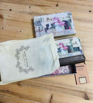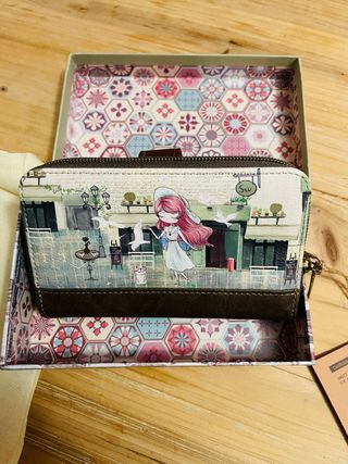 Preciosa cartera con un diseño artístico y colorido. - Ilustración de una chica con pelo rosa y un gatito. - Estampado de hexágonos en tonos rosas y azules en el interior y la caja. - Cierre de cremallera.