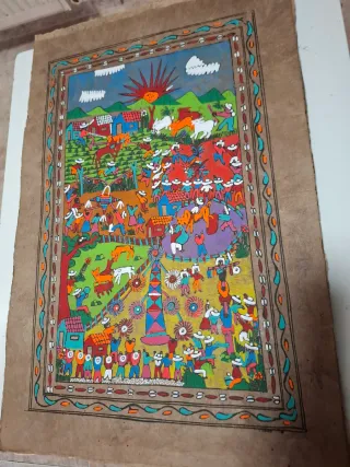 Auténtica pintura de arte popular mexicano, vibrante y llena de color. - Representación de escenas cotidianas y festivas. - Pintado sobre corteza de árbol. - Marco decorativo detallado. Uno 20e los 3 por 50e