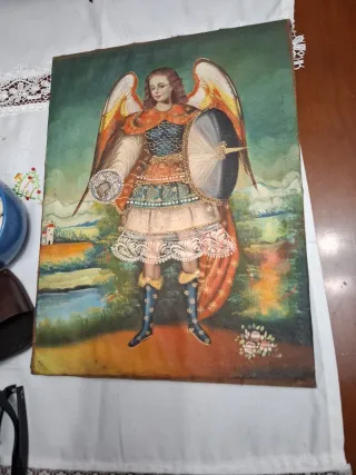 Pintura de un arcángel con armadura y alas. Medidas 30x40. - Representación detallada de la figura. - Fondo paisajístico con elementos naturales y una edificación. Con bastidor.