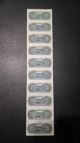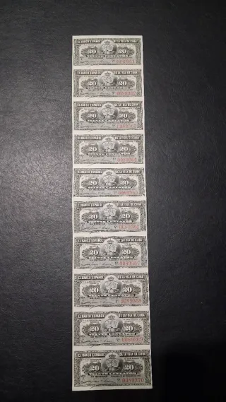 !! GRAN OPORTUNIDAD !! Lote de TIRADA DE 10 billetes de 20 centavos SIN CORTAR del Banco Español de la Isla de Cuba. - Serie de billetes con numeración consecutiva. - Diseño clásico con escudo y valor facial. - Ideal para coleccionistas de numismática cubana. - DISPONGO DE VARIAS TIRADAS,