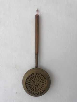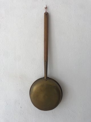 Antiguo calentador de cama con un diseño circular y un mango de madera. - Material del recipiente: latón. - Diseño del recipiente con perforaciones. - Mango de madera. Solo venta en persona
