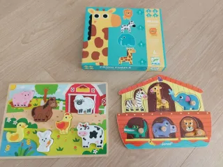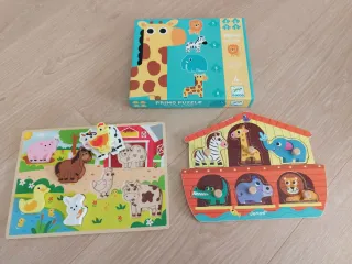 Conjunto de tres puzzles de madera para niños pequeños, con divertidos diseños de animales. - Puzzle de granja con 7 piezas. - Puzzle de animales en el arca con 6 piezas. - Puzzle de animales de la selva con 4 piezas.