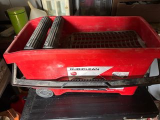 Cubo de limpieza Rubi de 24 litros de capacidad, ideal para trabajos de alicatado. Su diseño en color rojo lo hace fácilmente visible. - Ruedas para facilitar el transporte. - Rejilla interior para escurrir. - Asas para un mejor agarre.