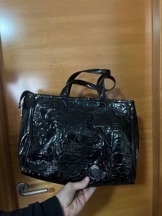 Bolso grande de charol negro de Calvin Klein. - Acabado brillante. - Asas cómodas para llevar. - Incluye un charm metálico con el logo. - Incluye bolsa para guardarlo. Precio a estrenar: 140€
