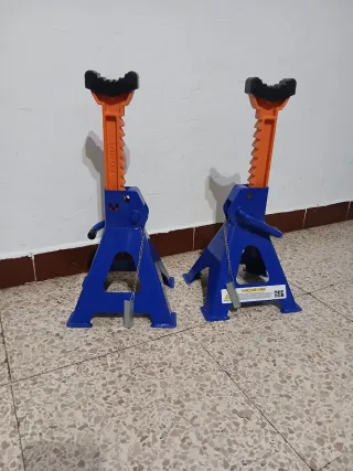 Par de caballetes de seguridad para vehículos con capacidad de 3 toneladas. - Color azul y naranja. - Mecanismo de trinquete para ajuste de altura. - Base ancha para mayor estabilidad.
