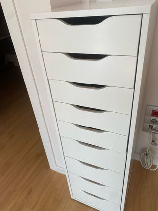 Cajonera de la marca Ikea en color blanco. Cuenta con múltiples cajones para almacenamiento. - Diseño moderno y funcional. - Ideal para organizar espacios.