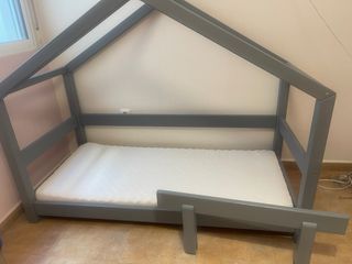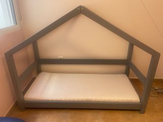 Cama de madera con diseño tipo casita, ideal para habitaciones infantiles. - Estructura de madera. - Colchón incluido.