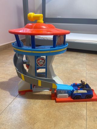 Centro de mando de la Patrulla Canina con vehículo. - Torre de vigilancia con tobogán. - Incluye un vehículo azul de la Patrulla Canina. - Figura de un cachorro. - Base de juego con plataforma.