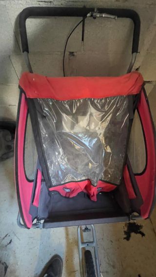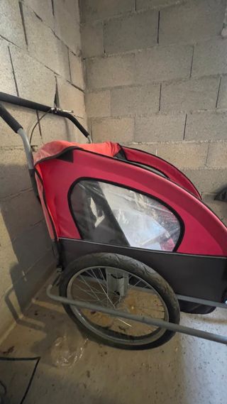 Carrito versátil para transportar niños o mascotas. Ideal para paseos y actividades al aire libre. - Diseño en color rojo y negro. - Ventanas transparentes para visibilidad. - Rueda delantera para fácil maniobrabilidad.