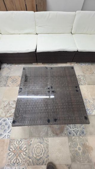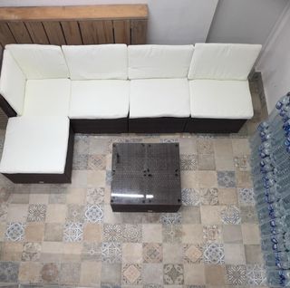 Sofá de exterior o de jardín en imitación ratan marrón usado solamente 1 verano pueees combinarlo como quieras pero en esta combinación mide 2,77 de largo (la parte larga) 1,40 de ancho (la parte que hace de chaise longue) 70 ( el ancho del sofá donde se sienta) y 54 (de alto hasta la parte mas alta del respaldo) va con los cojines y se compró en la página VidaXL
