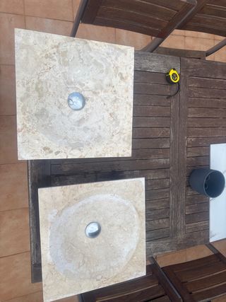 Conjunto de dos lavabos de piedra natural con un diseño moderno y elegante. - Acabado en mármol veteado. - Tonos beige y blanco que combinan fácilmente. - Diseño cuadrado con desagüe central.