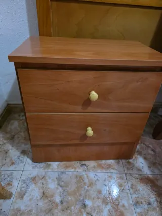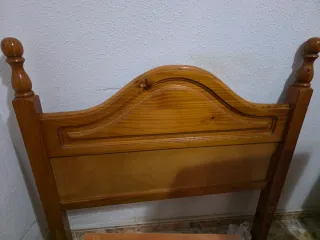 Conjunto de cabezal y mesita de noche de madera con un diseño clásico. - Acabado en tono miel. - Detalles tallados en el cabezal. - Patas torneadas en los laterales.
