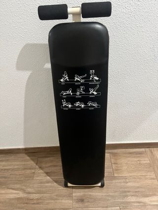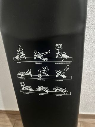 Tabla de ejercicios para trabajar diferentes grupos musculares. Incluye ilustraciones de ejercicios para bíceps, abductor, hombros, lumbar, abdominales, pectoral, butterfly y pullover. - Diseño en blanco sobre fondo negro. - Ilustraciones claras de cada ejercicio.