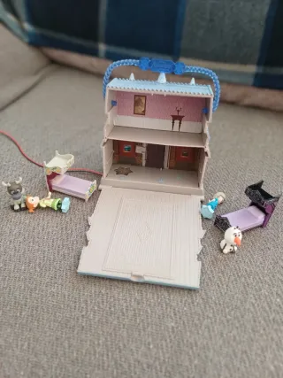 Casita decorativa inspirada en Frozen. Ideal para coleccionistas o como adorno. - Diseño detallado de castillo. - Tonos azules y blancos brillantes. - Base de color beige.
