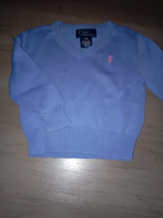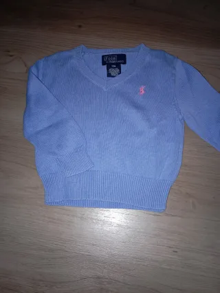 Jersey de punto para niño de la marca Polo Ralph Lauren. - Color azul claro. - Cuello en V. - Logo de la marca en color rosa. - Manga larga.
