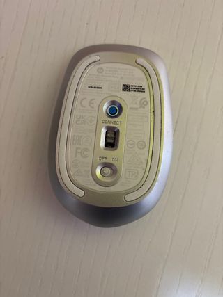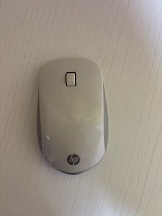 Ratón inalámbrico de la marca HP en color gris y blanco. - Diseño ergonómico. - Rueda de desplazamiento. - Botón de clic. -No tengo la caja