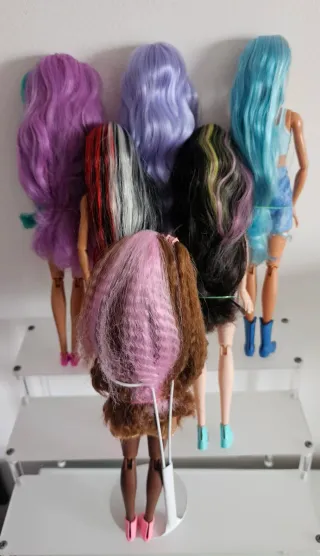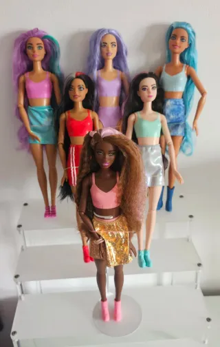 Lote de 6 muñecas Barbie Cutie Reveal. - Muñecas con pelo de colores vibrantes. - Incluyen faldas brillantes y coloridas. - Cada muñeca tiene un estilo único.