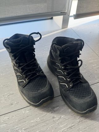 Calzado de seguridad de caña alta. Robusta Tiburón Nuevos cuestan 100€ Con membrana Gore Tex - Cierre con cordones. - Diseño moderno con detalles blancos. Serraje Nobuck y rejilla textil alta tenacidad Puntera no metálica 200 Usados pocas veces. Tienen un poco de polvo por usarlos en obra, pero con un lavado quedan como nuevos