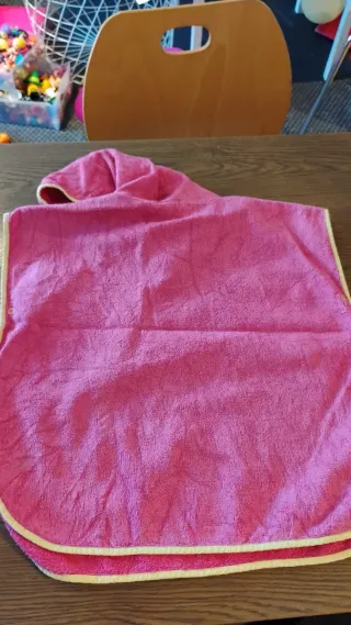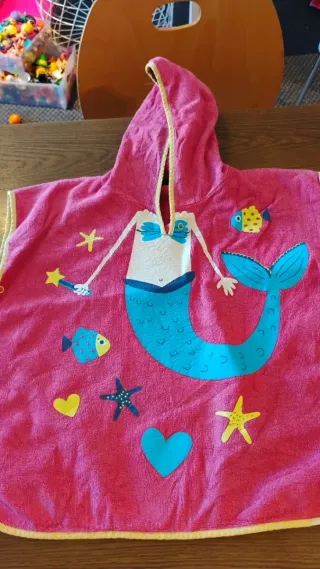 Toalla tipo poncho para niños con un divertido diseño de sirena. - Color rosa vibrante. - Capucha incorporada. - Estampado de sirena, peces y estrellas de mar. - Ribete amarillo en capucha y bajo.