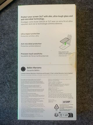 Protector de pantalla Belkin SCREENFORCE InvisiGlass Ultra Anti-Microbial para iPhone 11 y iPhone XR. - Protección antimicrobiana. - Vidrio reforzado por intercambio de iones. - Aplicación fácil y precisa. - 40% más resistente que el vidrio templado. Se compró por error y no me di cuenta hasta que fui a ponerlo y vi que no encajaba. Al pasar mucho tiempo, no lo podia devolver.