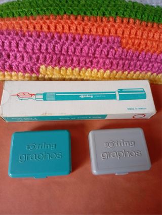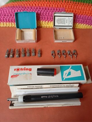 Conjunto de cajas y accesorios para el sistema de dibujo técnico Rotring Graphos. - Incluye dos estuches de almacenamiento Contenido: una caja rotring graphos con 7 punteras lineal, 0,3/0,4/0,5/0,6/0,8/1,00/1,25mm. Una caja rotring graphos con 5 punteras tubulares, 0,3/0,4/0,5/0,6/0,8mm, nuevo a estrenar. Todo el conjunto 32€ - Cuerpo principal del Rotring Graphos.