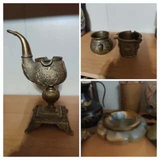 Conjunto de ceniceros vintage con un diseño elaborado en bronce. - Pieza con forma de pipa. - Dos pequeños recipientes decorados. 30€ los 4