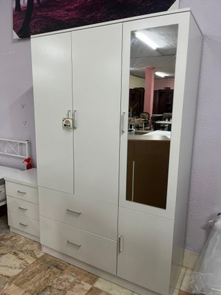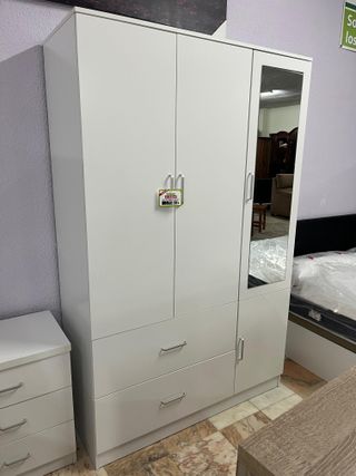 Armario de diseño moderno con acabado en blanco y puerta con espejo. Tambien lo tengo de cuatro puertas con dos espejos. Diferentes colores disponibles. Producto nuevo en caja MONTAJE 20eu más Hacemos envios SOMOS TIENDA FISICA - Puertas con tiradores metálicos. - Cajones inferiores para almacenamiento adicional. -Varios compartimentos diferentes.