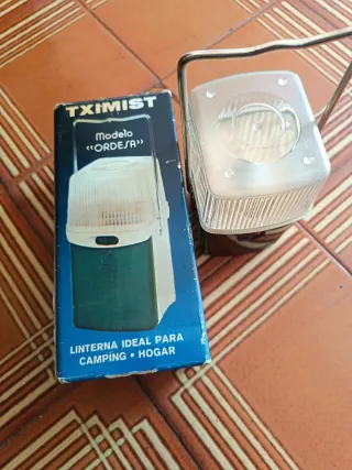 Linterna vintage TXIMIST modelo Ordesa, ideal para camping o el hogar. - Diseño clásico y funcional. - Asa metálica para transporte. - Interruptor rojo de encendido/apagado.