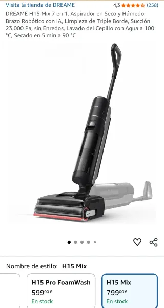 PVP: 799€ Prácticamente nuevo. Solo se ha usado (y muy poco) el cuerpo principal y cepillo multisuperficie. Leve arañazo (ver ultima foto). Lo demás como nuevo. Dreame H15 Mix, el modelo más versátil: - ASPIRA Y FRIEGA A LA VEZ: Limpia sólidos y líquidos en una pasada con agua caliente. Suelos secos e impecables al instante. - ASPIRACIÓN VERTICAL: Se convierte en aspiradora de mano o de escoba para alfombras y muebles. - 7 FUNCIONES EN 1: Accesorios para sofás (ácaros) y rincones difíciles. - AUTOLIMPIEZA INTELIGENTE: Al terminar, se lava sola en la base y se seca con aire caliente para evitar humedad y malos olores.