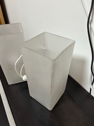 Vendo dos lámparas de mesita de diseño sencillo y moderno, con pantalla de cristal traslúcido y forma rectangular. perfectas para dormitorio, mesillas o luz ambiental. ✔️ Funcionan correctamente ✔️ Cableado original ✔️ Estilo minimalista, fácil de combinar ⚠️ Importante: Una de las lámparas tiene un pequeño daño en el cristal (ligeramente roto), visible de cerca, pero no afecta a su funcionamiento. Se venden juntas. Ideales si buscas un conjunto económico
