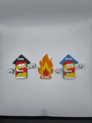 Se realizan Pines falleros o sujeta pañuelos falleros en 3D con un diseño llamativo.Se pueden personalizar,colores a elegir. - Diseño de cohete con sombrero. - Diseño de llama de fuego.
